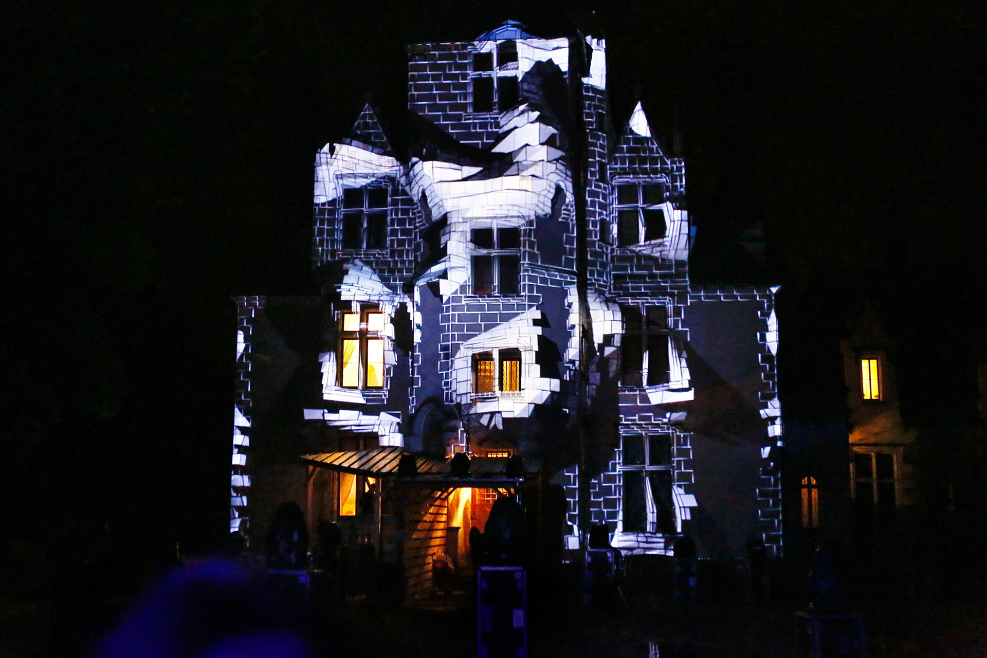 Contrairement à la majorité des mappings, ce n’est pas le volume architectural en 3D qui a servi de base à l’écriture du projet, mais l’emplacement de chaque pierre, chaque ligne du château de Candé qui a été redessiné pour être ensuite interprété et exploité par le programme. A partir de l’extrapolation de ces informations, l’outil informatique a permis d’insuffler le mouvement et la lumière pour transfigurer le château.