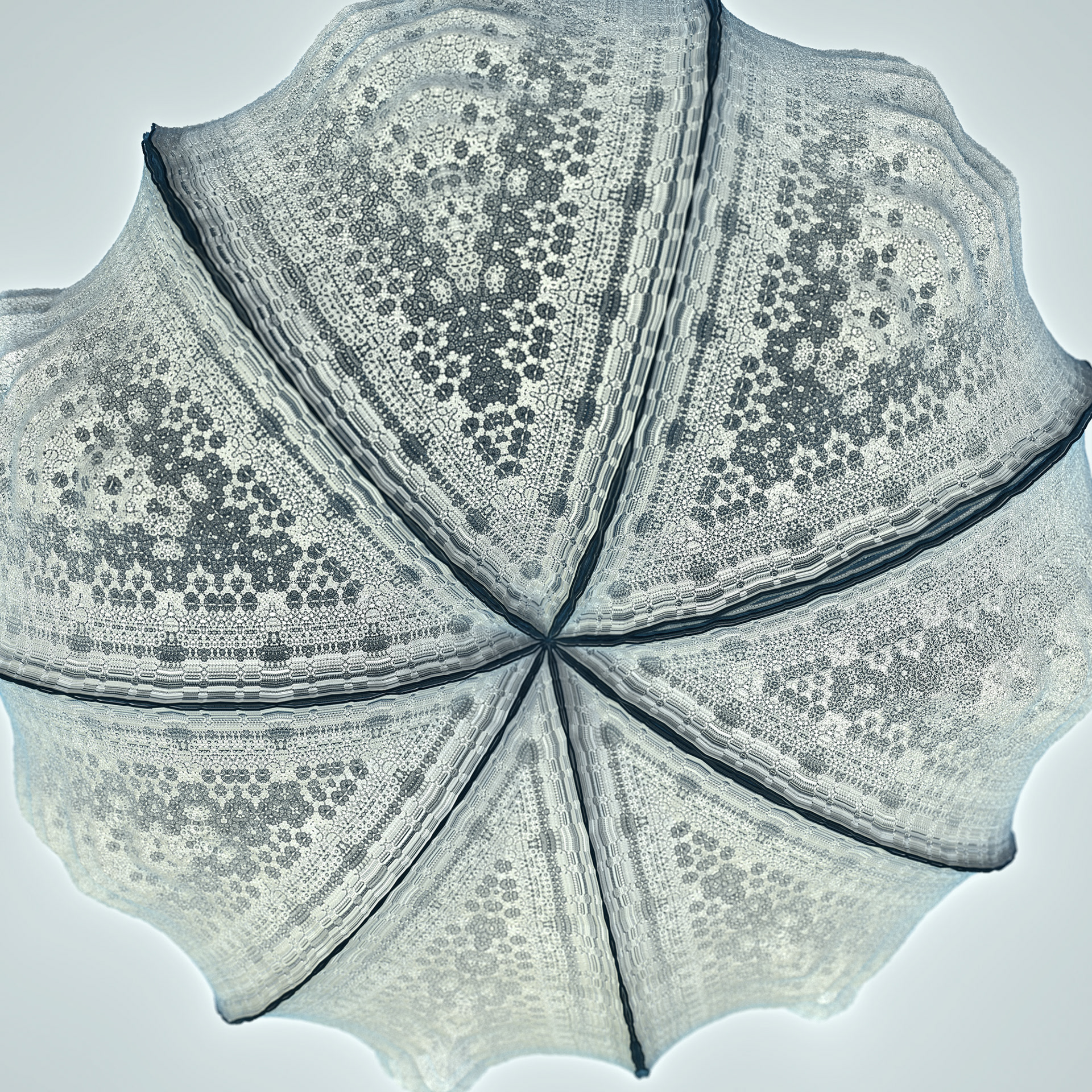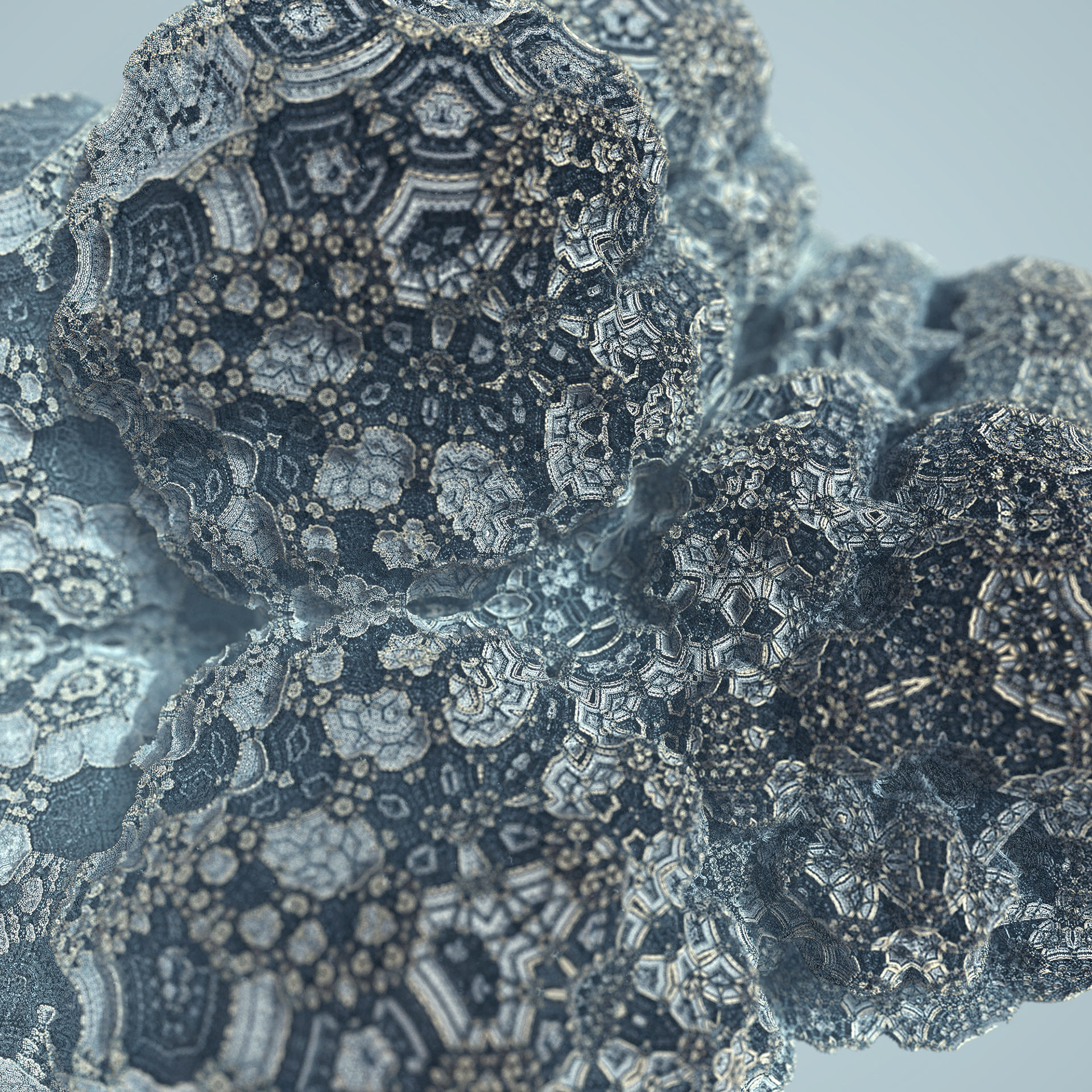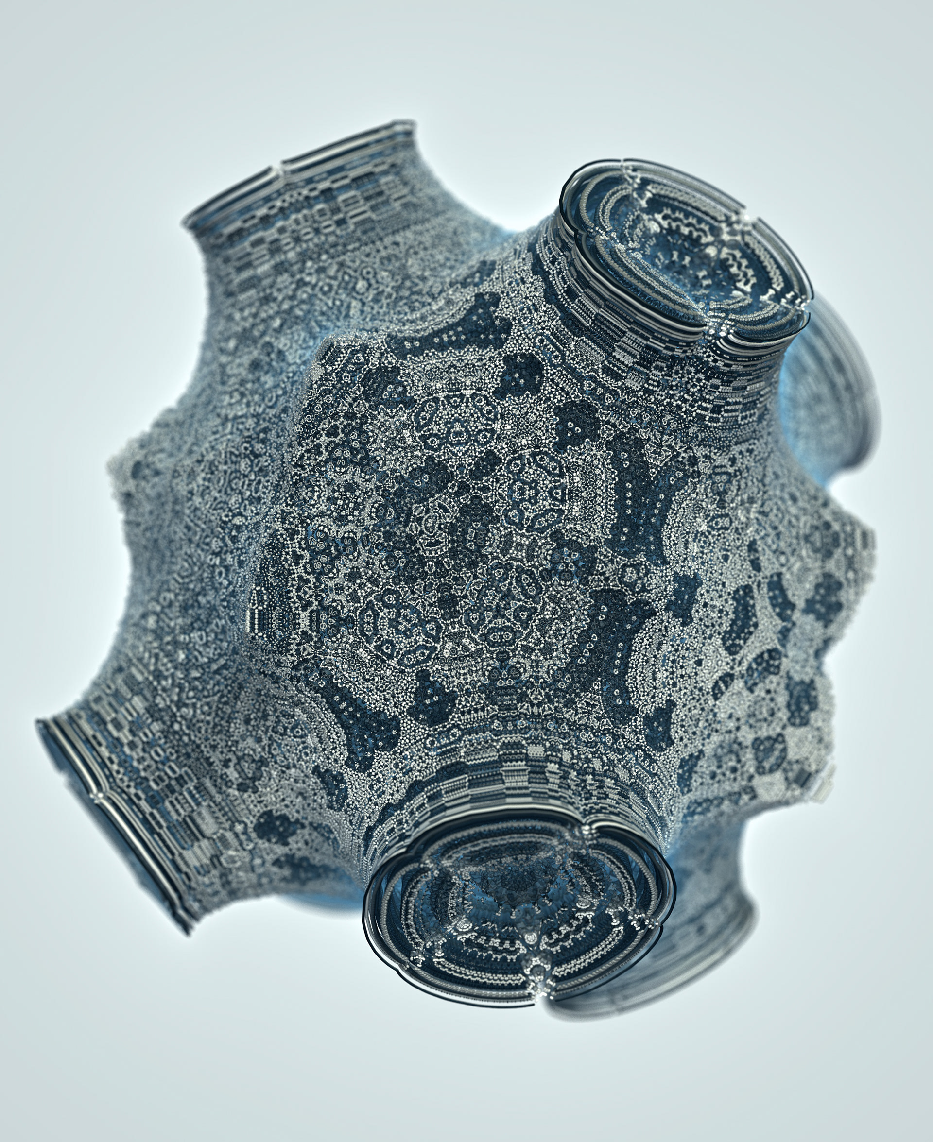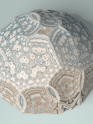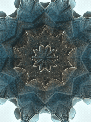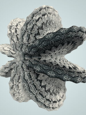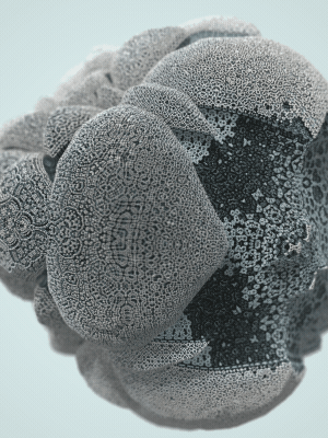 The Floating Points video was created to illustrate the song of the same name by composer Zero Gr4vity. Created entirely in computer code (C++ and GLSL), the animation explores the world of 3D fractals, in particular Kaleidoscopic IFS. Somewhere between abstraction and generative art, the images created tend towards organic and sometimes floral aesthetics. While each form is born of the abstraction of equations, we can nonetheless see and recognise an aesthetic that is reminiscent of biological or marine scientific iconography. It is in this direction that the clip takes shape, revealing an entirely fictitious macroscopic bestiary. In the tradition of the botanical plates of Ernst Haeckel (1834-1919), the viewer can discover a collection of cellular organisms and phytoplankton revealed through the prism of an algorithm diverted from its original function.