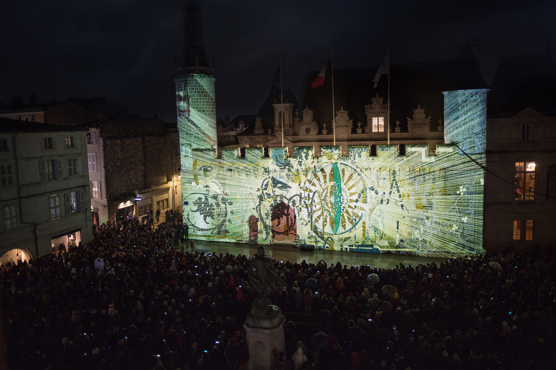 Imagined and created especially for the opening celebration of town hall of La Rochelle in December 2019, the project is based on the very particular setting of the last 6 years of renovation of the building itself. A period during which the town hall was partly hidden by scaffolding. The idea of a fictive renovation of the main outside walls of the building and more precisely the construction of an imaginary new gateway in the centre serves as a guiding theme for the project. About ten paintings were imagined around this notion of a gateway. They were composed with a strong reference to marine iconography in the first part, then inspired by the celestial vault and finally by terrestrial and vegetal elements. All the images were created with my own software developed with the C++ libcinder framework and then mounted in Adobe After effect.
