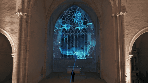 Initié en 2016 à la Collégiale Saint Martin d’Angers, le projet S.C.U.L.P.T a été entièrement repensé pour le site de l’Abbaye Royale de l’Epau. La fresque lumineuse a été redessinée pour qu’elle épouse à la perfection chaque centimètre carré du chevet de l’église abbatiale, vieux de plusieurs siècles. Conçu sur mesure pour le lieu, ce projet à mi-chemin entre installation interactive et mapping permet au public de manipuler en temps réel la projection à l’aide d’un faisceau laser.