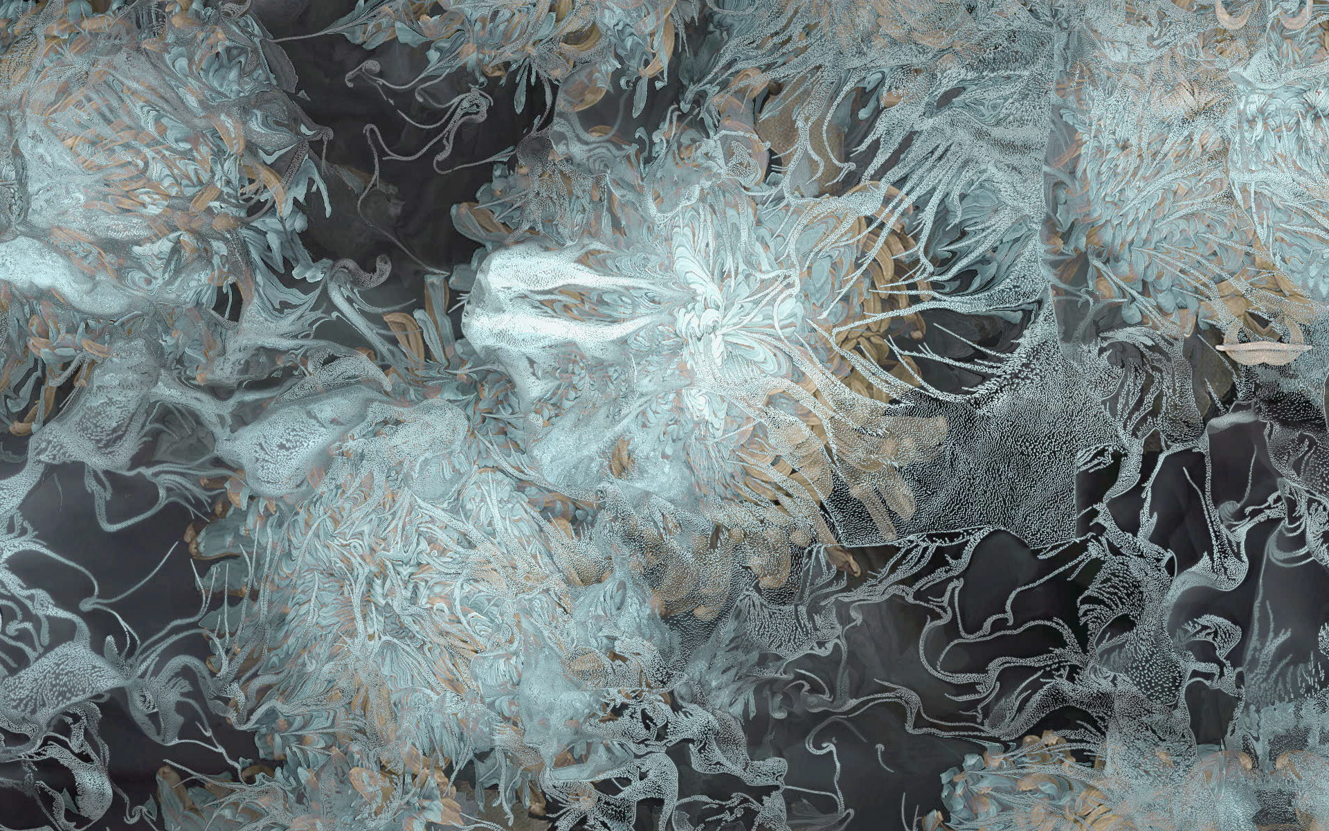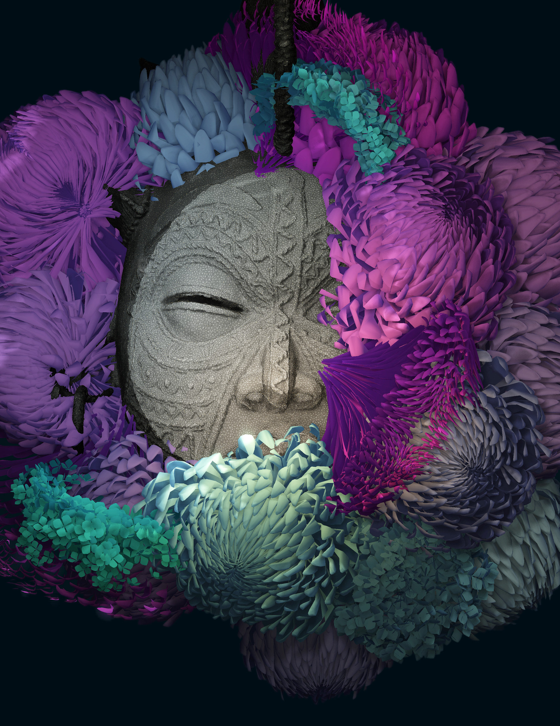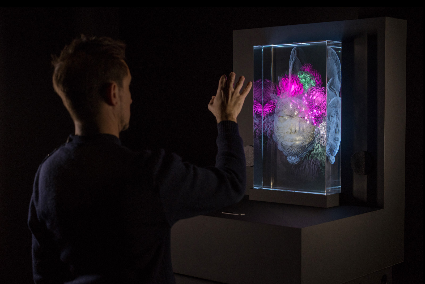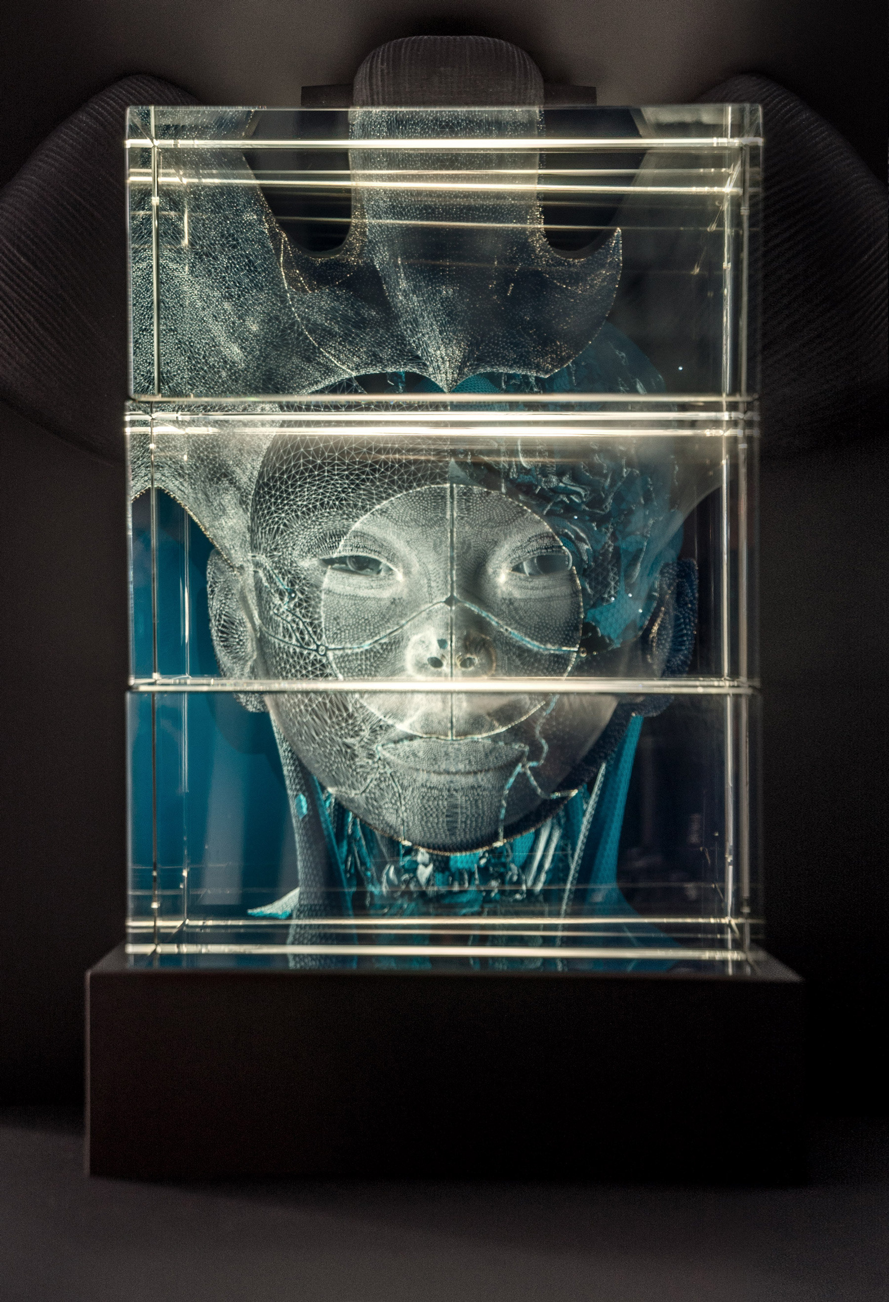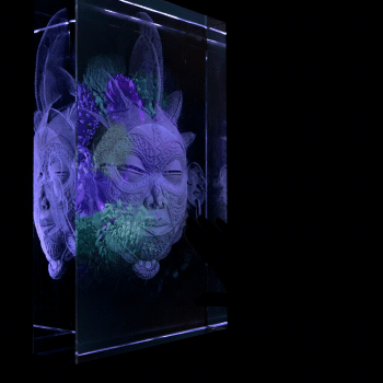 The Asteraceae are an order of plants with a wide range of species, including chrysanthemums. Asteriales uses a traditional African mask, the digitised version of which is strewn with asteraceae. Laser-engraved in a block of glass, the sculpture of the mask is augmented here by light and projection. The combination of an element of African culture, technology, glass and flora creates a singular, anachronistic installation that sums up the richness of Yann Nguema's research work particularly well.