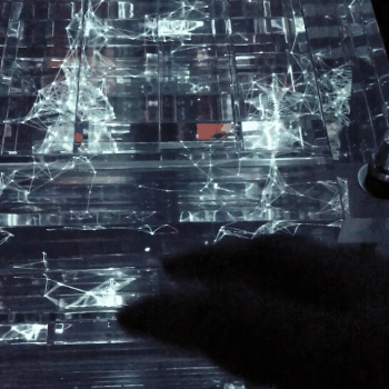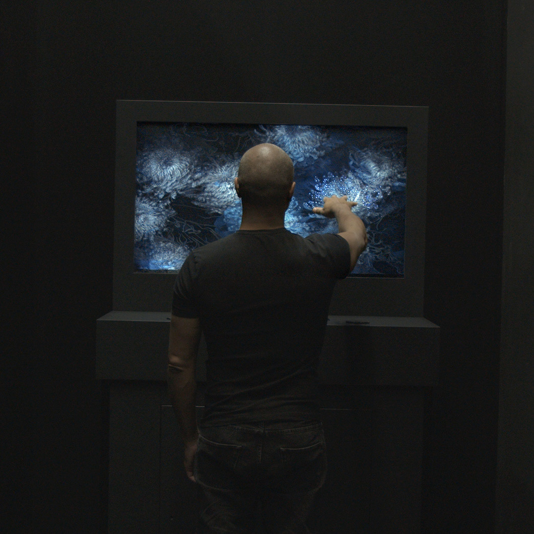 Le lichen est un champignon, associé à une algue. Il pousse là où aucune plante ne peut vivre. Il décore de plaques polychromes les rochers, l’écorce des arbres, les branches... Lichen est basée sur un algorithme qui se nourrit du relief existant pour évoluer. Ce lichen lumineux se répand, coule, croît le long des aspérités de la pierre et vous offre le loisir d’en saisir la complexité et la poésie, ou d’intervenir avec vos mains pour modifier son évolution.