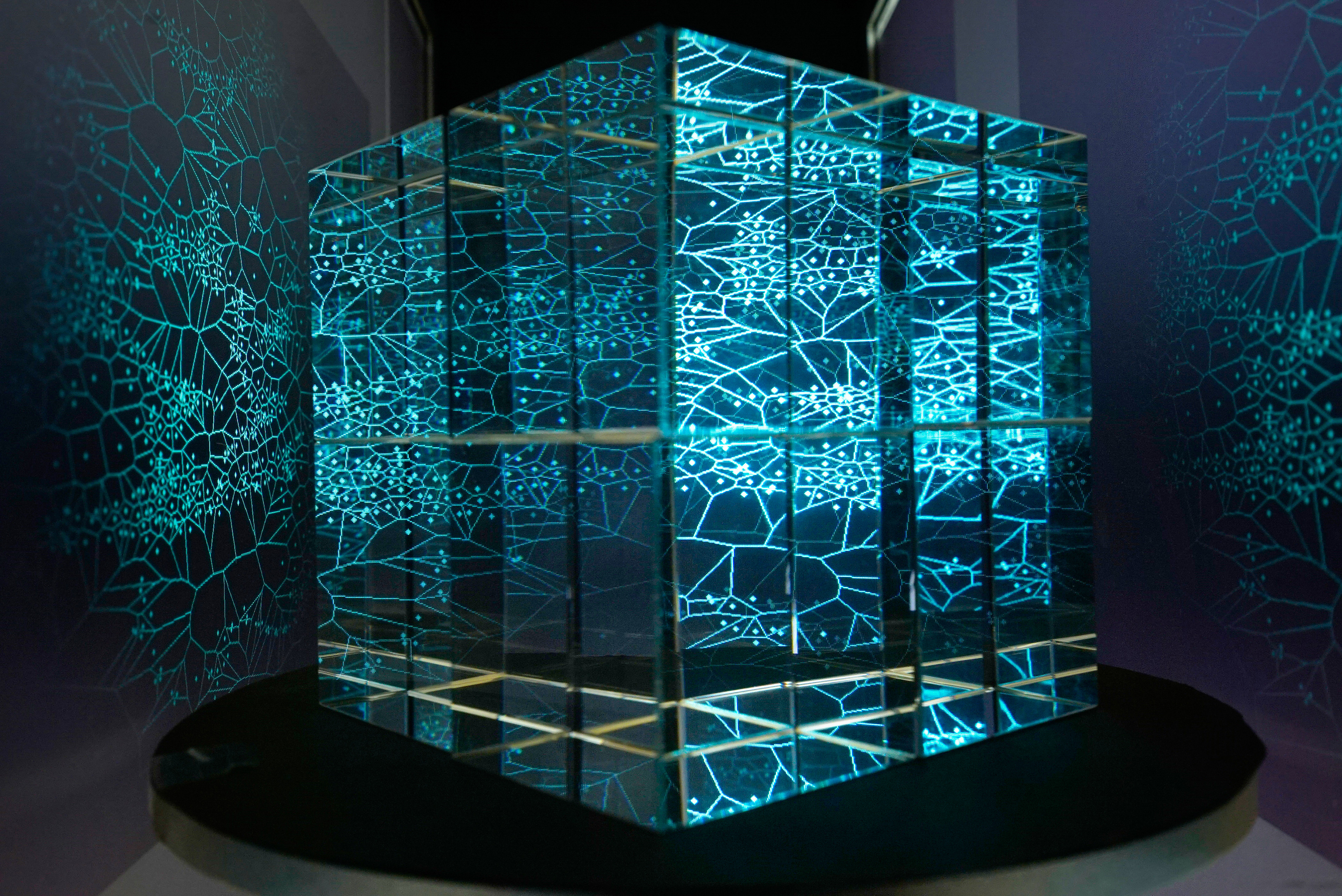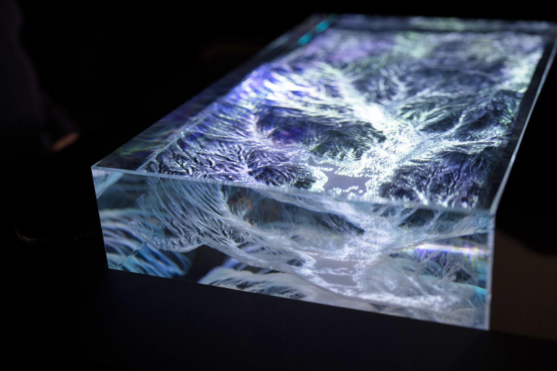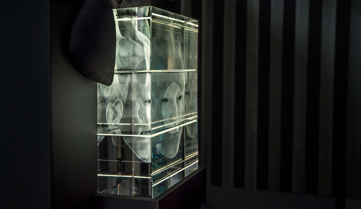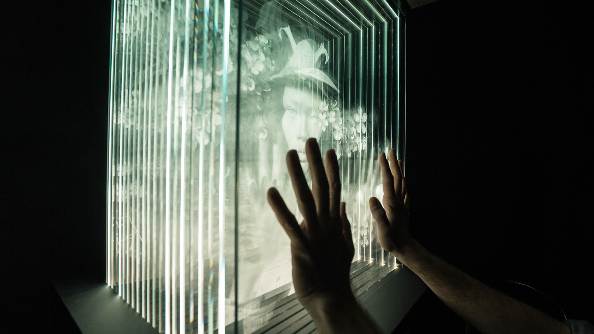 The Alta project combines projection and laser engraving in a block of glass. The density of the engraving points is exploited to the full to enable an image to be projected onto it.