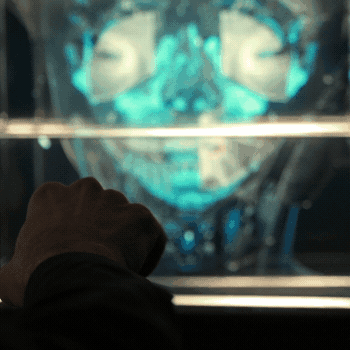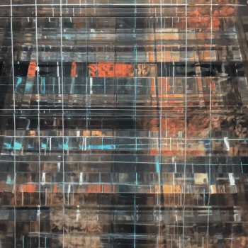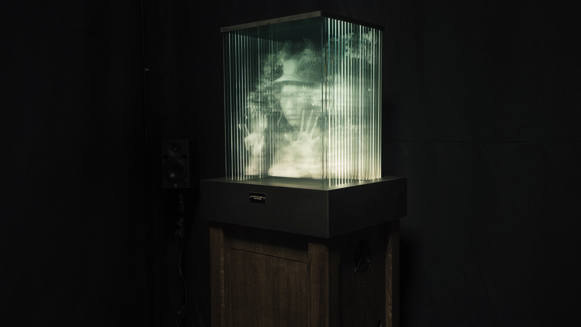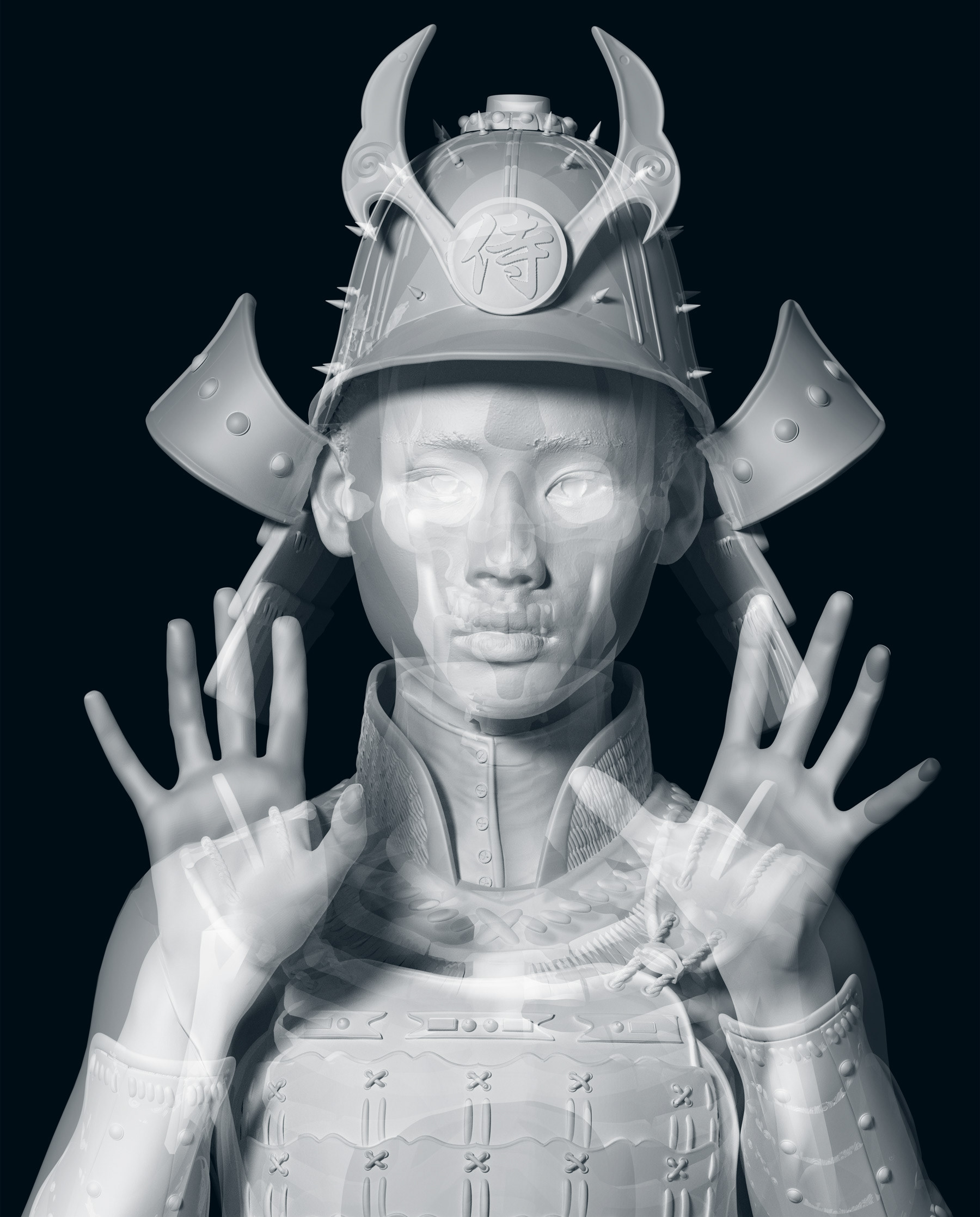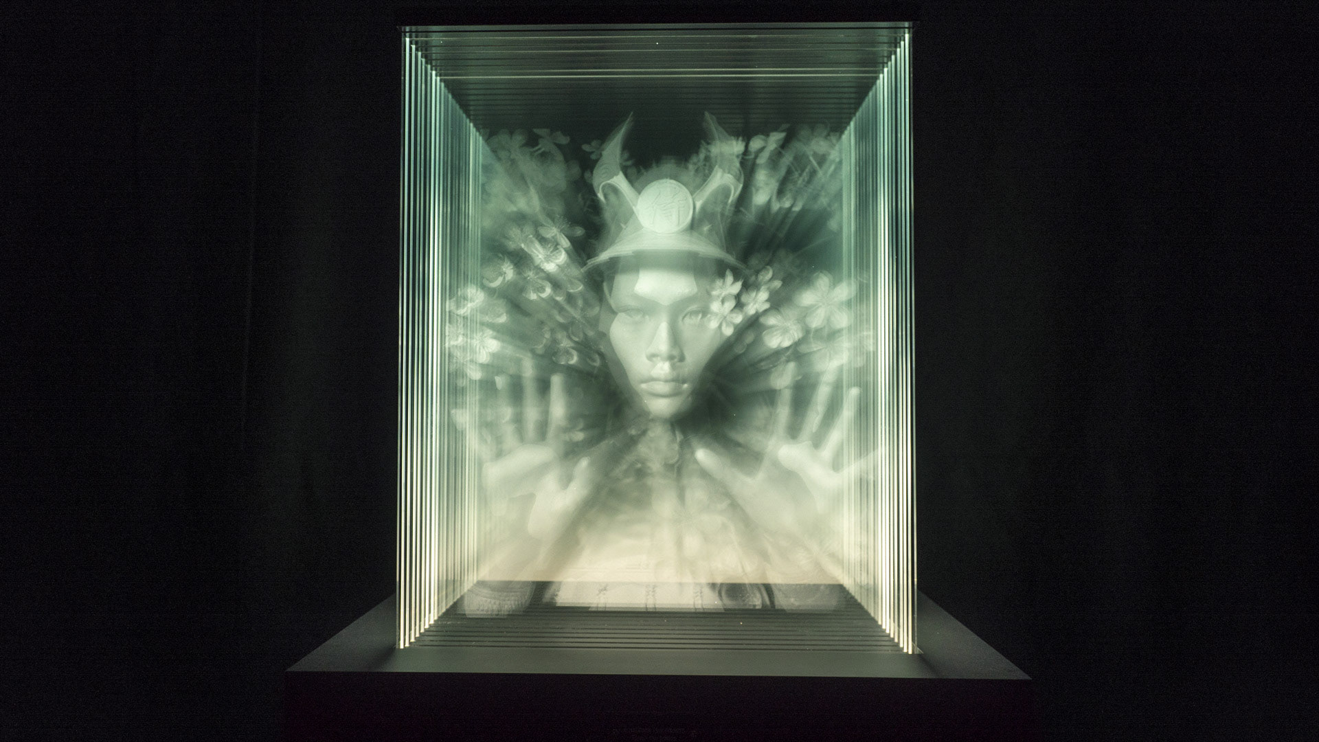 Strata uses 20 laser-engraved glass panels with a 3D sculpture of a samurai. A lighting system allows each plate to be lit independently. The installation tends towards light sculpture and resembles a 3D hologram.