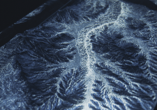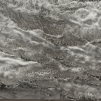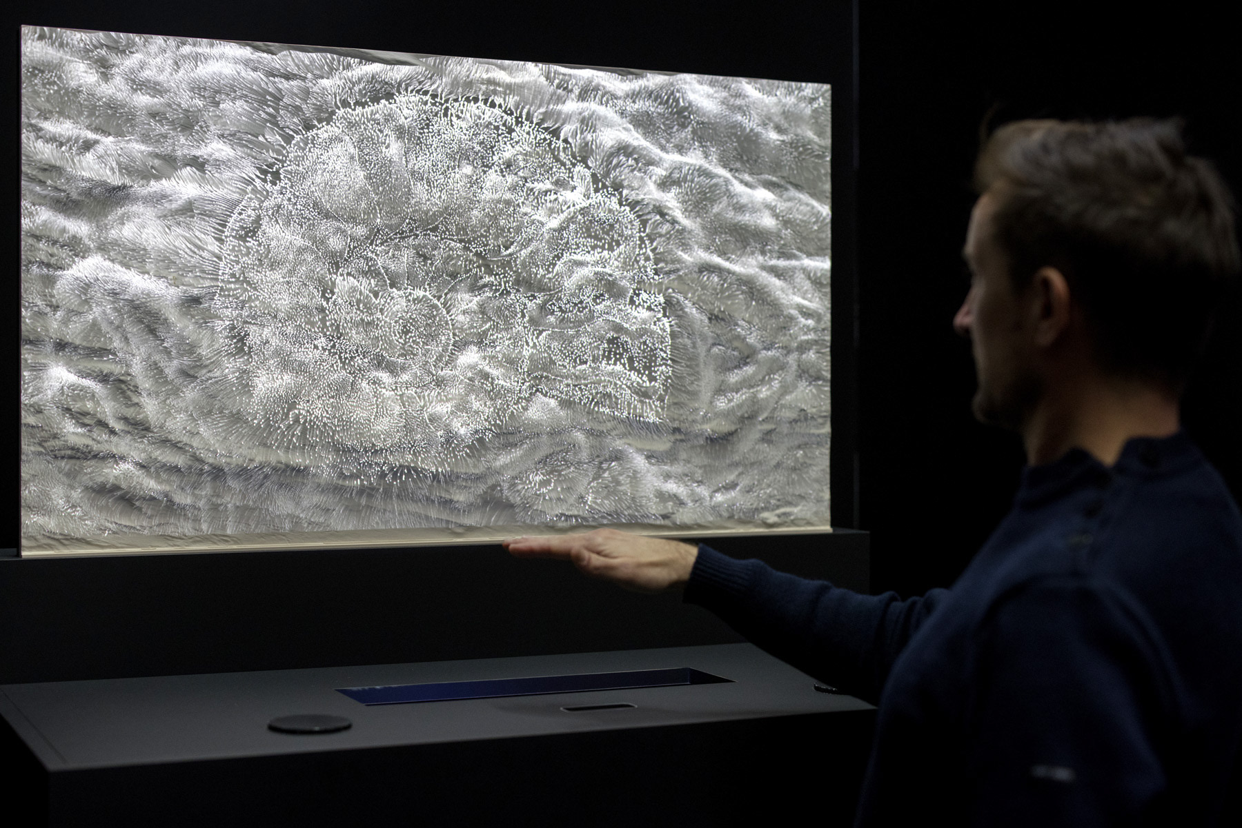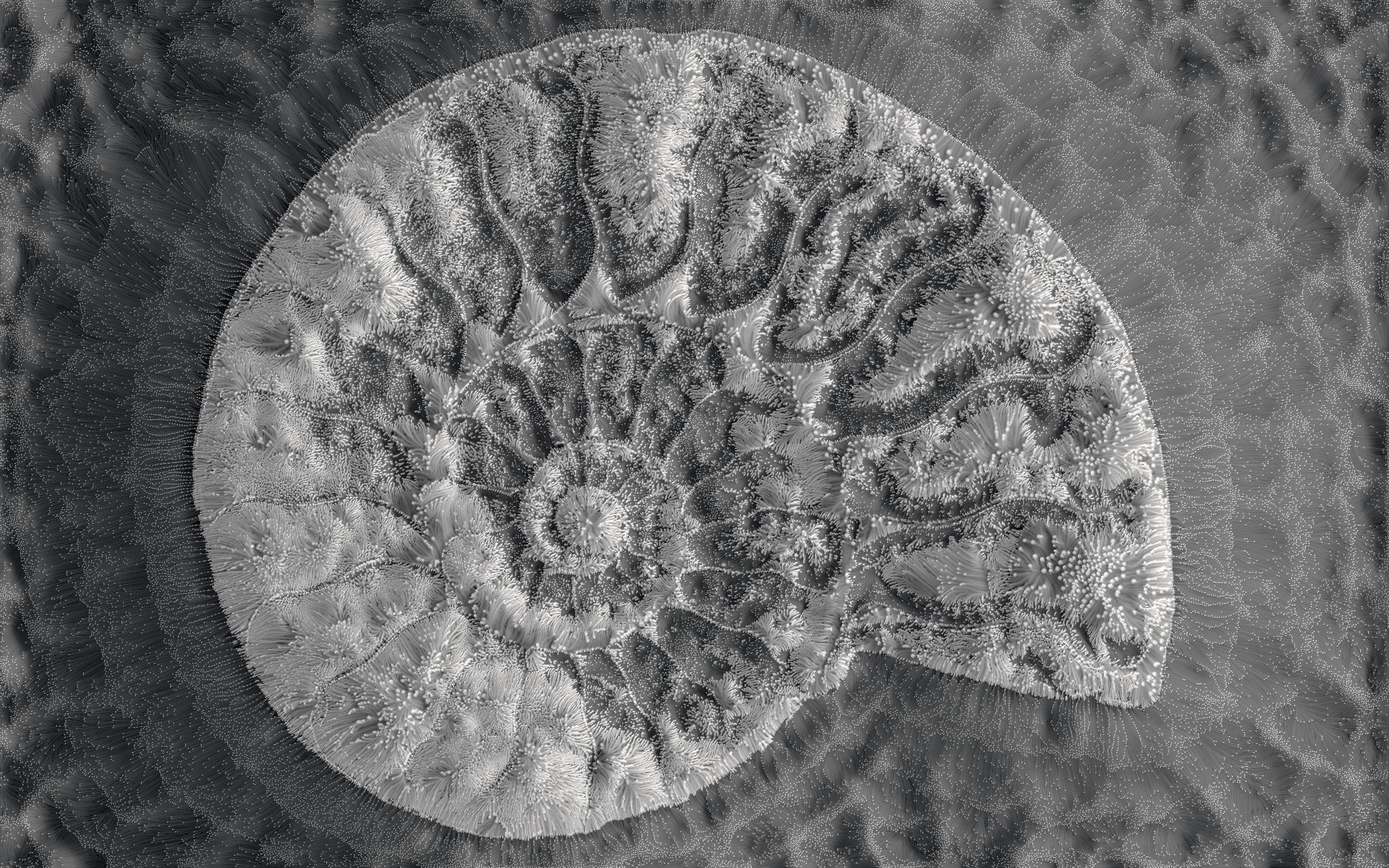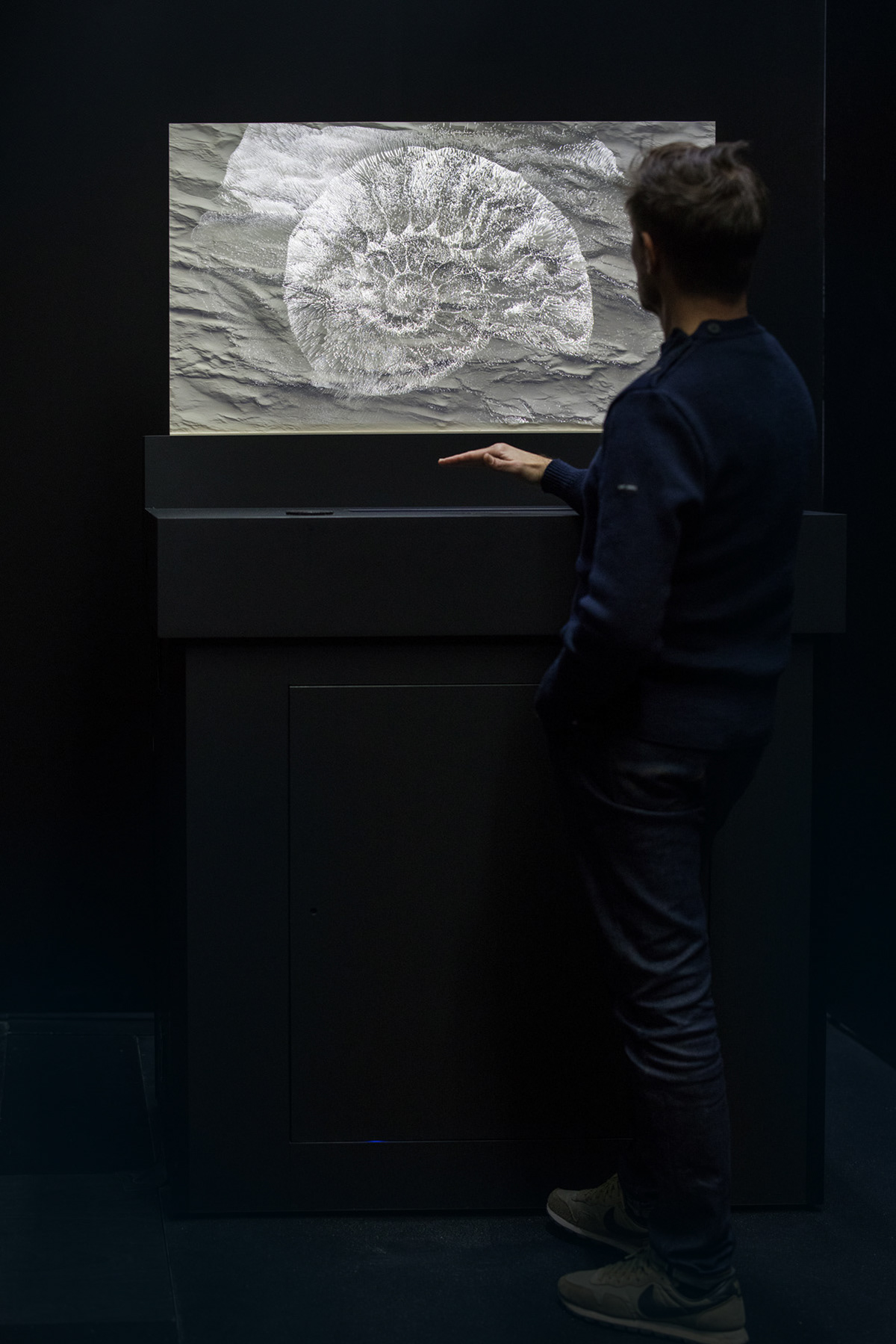 Lichens are fungi associated with algae. It grows where no plant can live. It decorates rocks, tree bark and branches with polychrome patches... Lichen is based on an algorithm that feeds off existing relief to evolve. This luminous lichen spreads, flows and grows along the asperities of the stone, giving you the opportunity to grasp its complexity and poetry, or to intervene with your hands to modify its evolution.