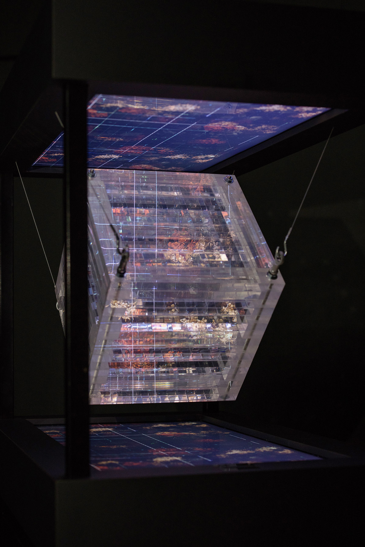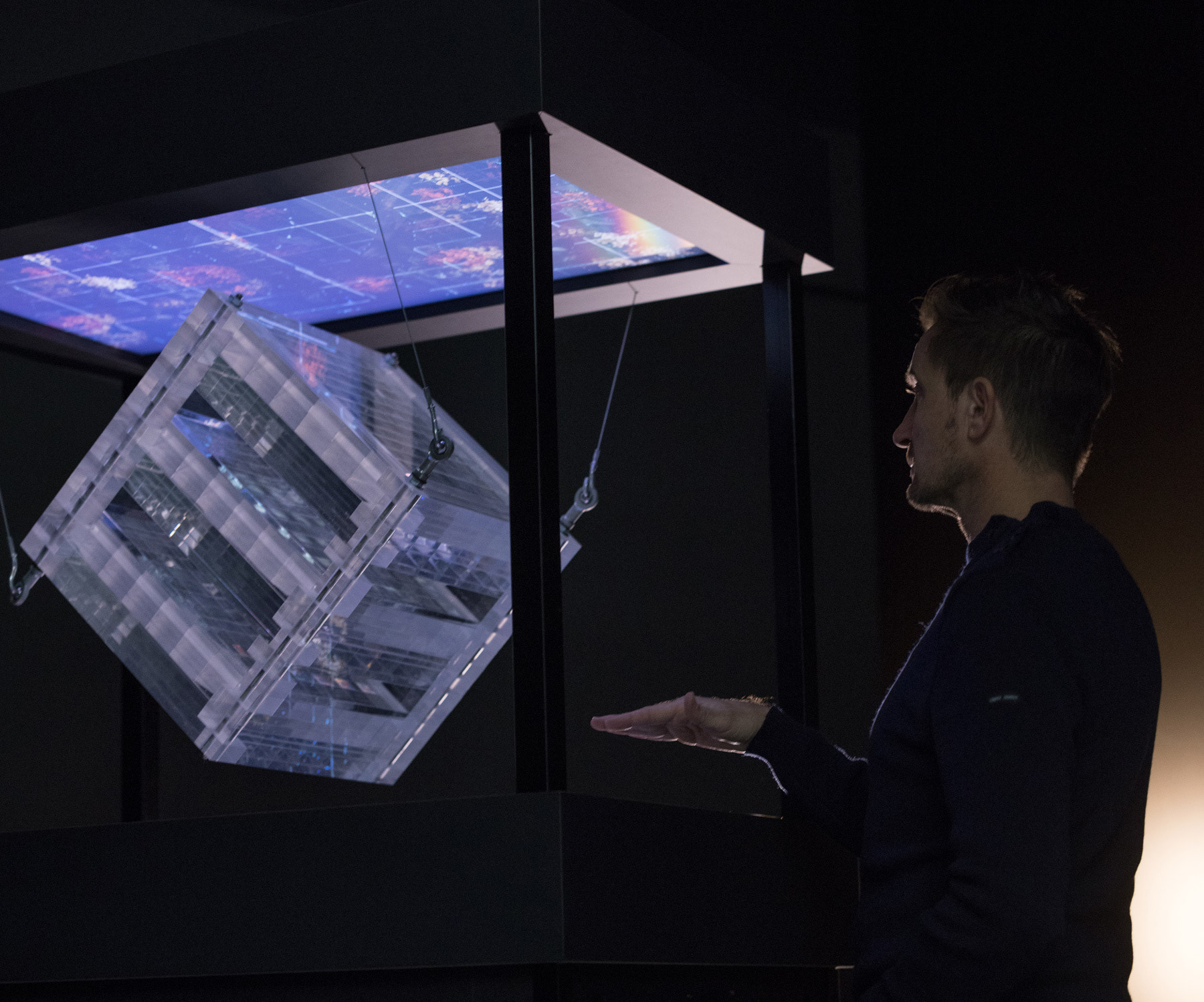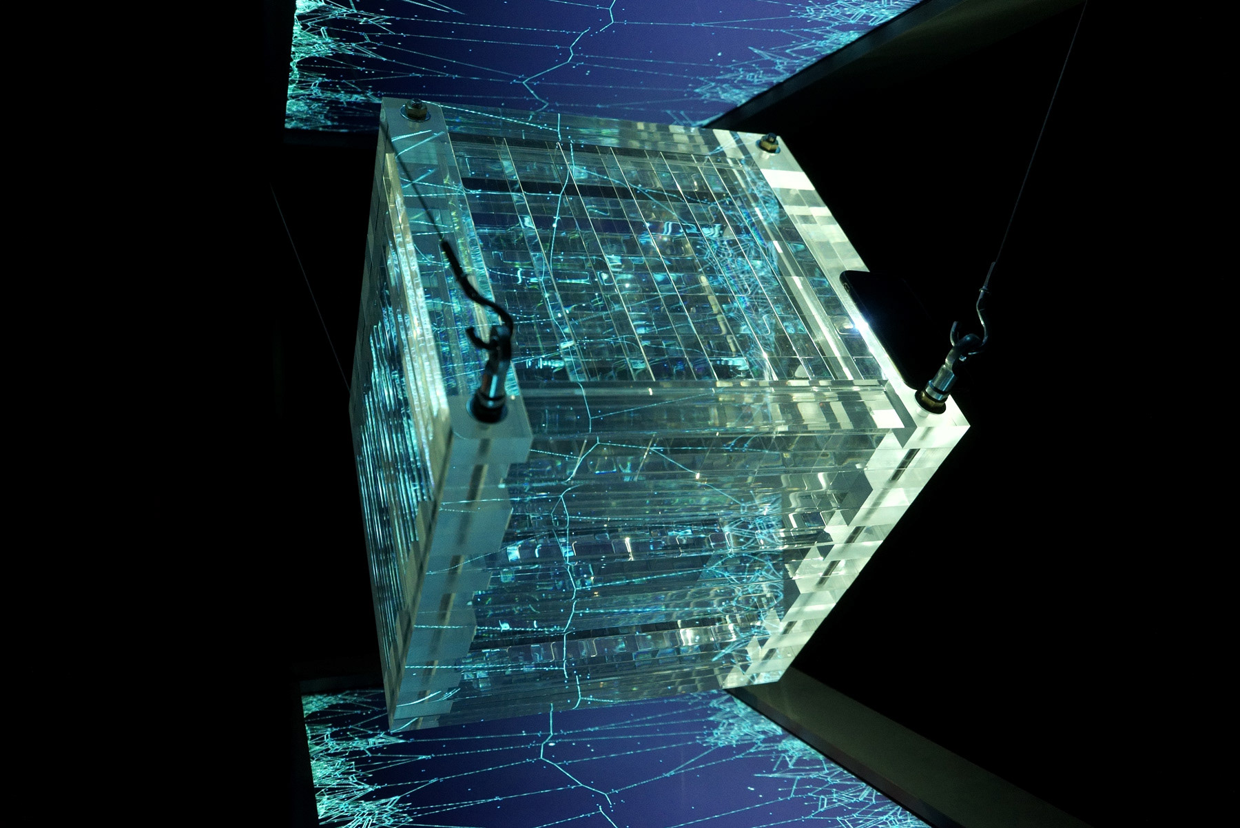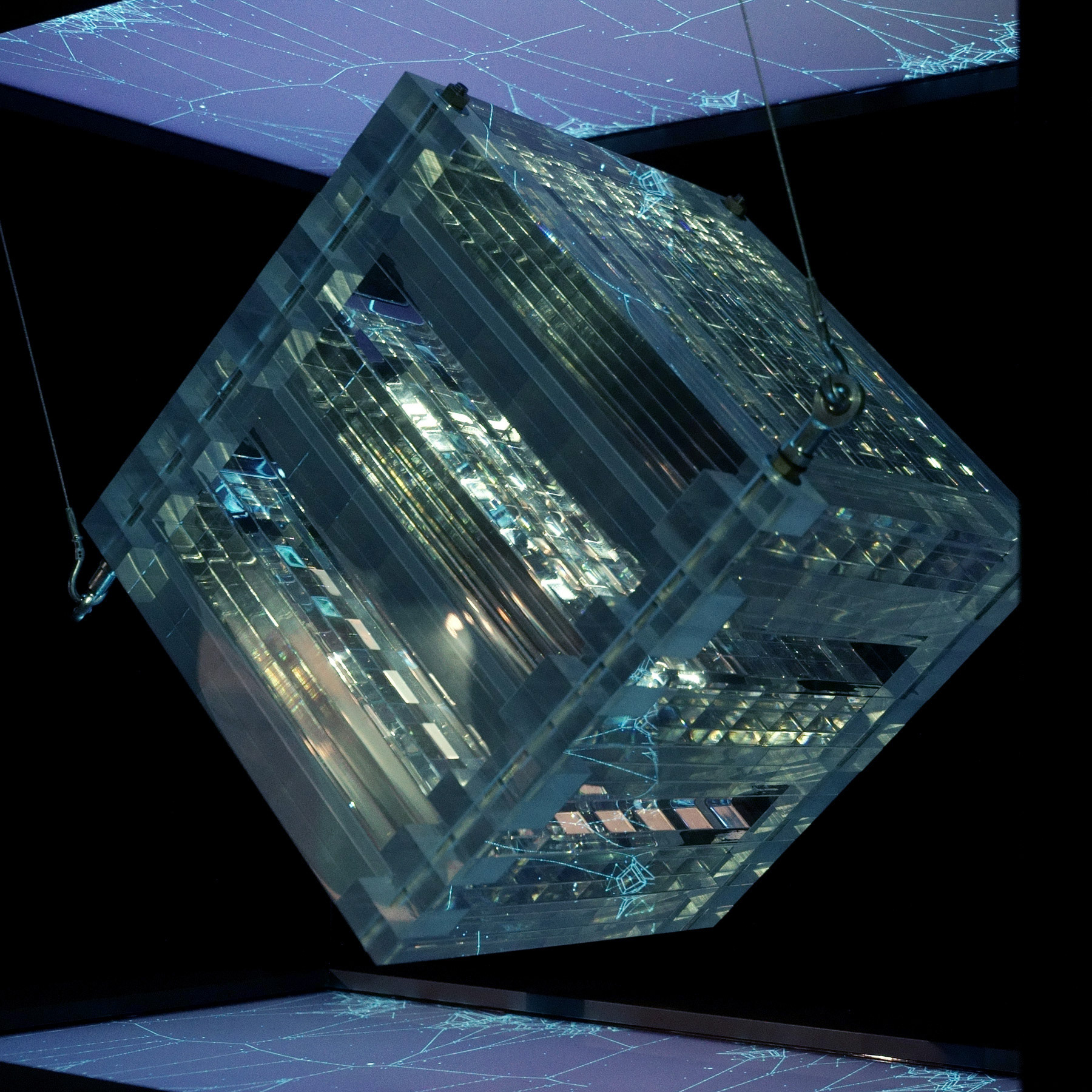 The soléidoscope is an interactive display system using reflection. Part screen, part light installation, it creates the illusion that the image is suspended in the transparent material of the cube. Its name is inspired by the kaleidoscope, with which it shares the principle of light fragmentation and image deconstruction.
