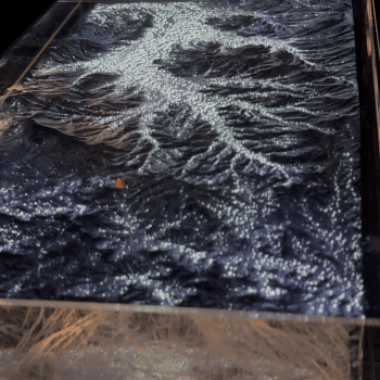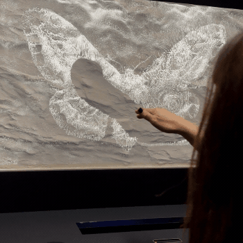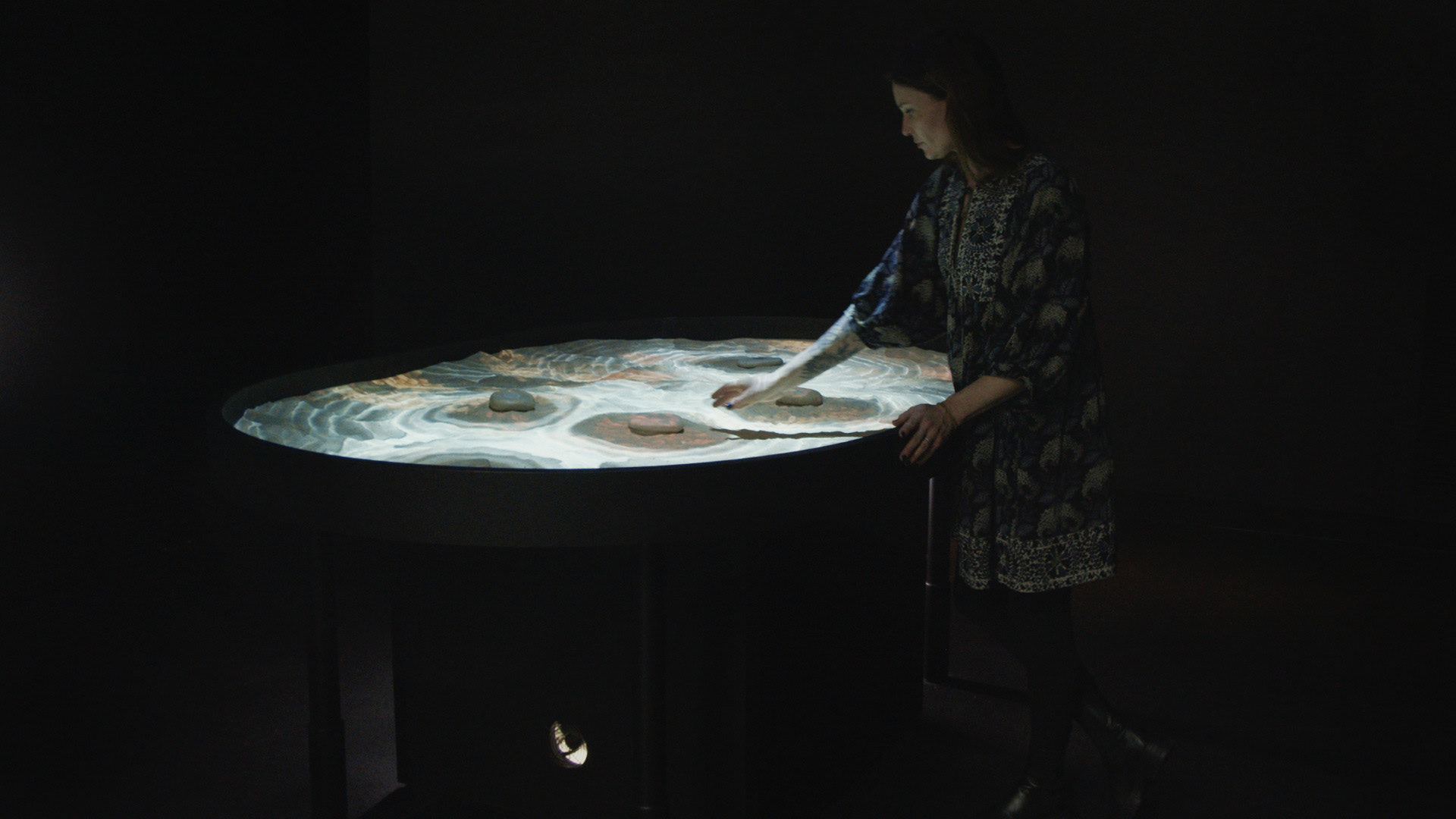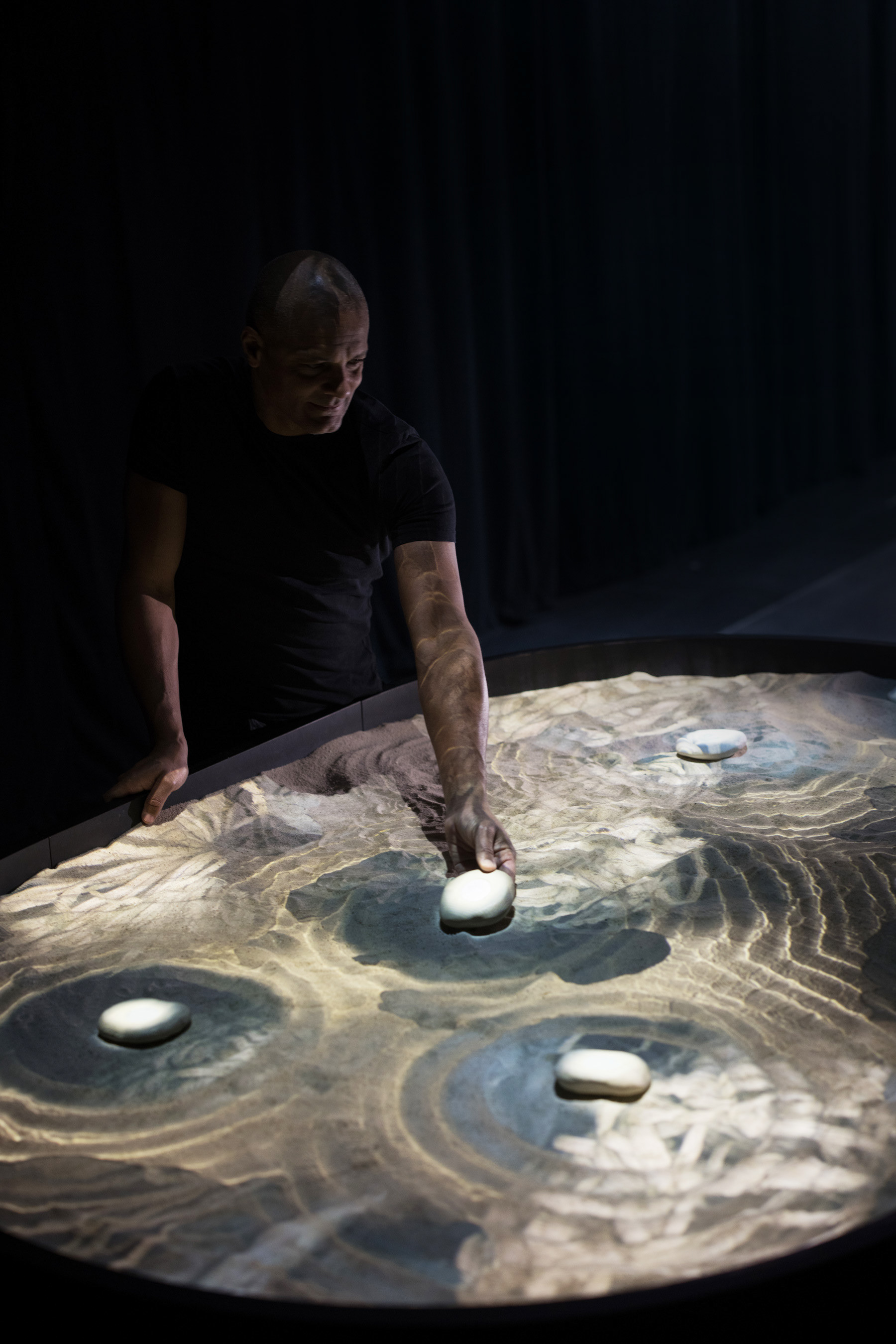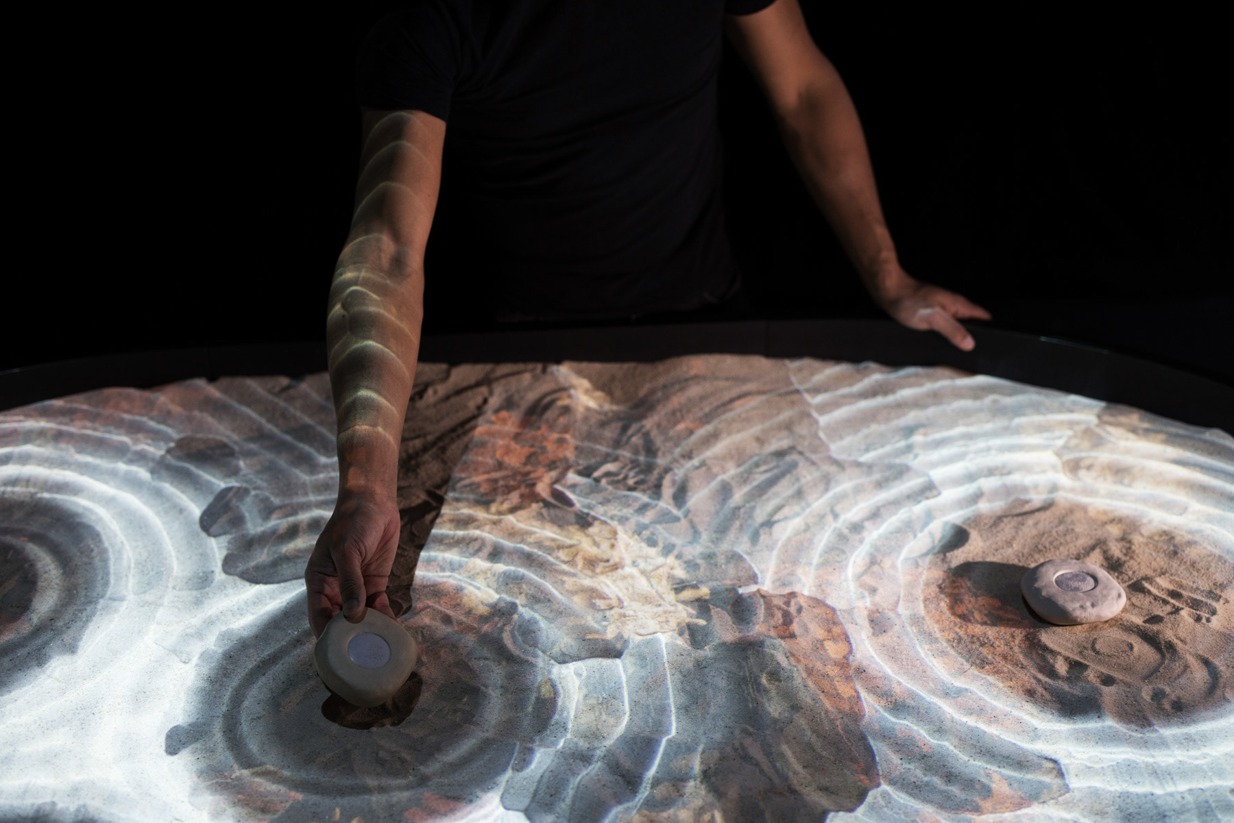 Lithos ammos is an interactive table on which 200 kg of white sand rests. This installation was designed for the Musée d'Amboise using sand and pebbles from the Loire. It offered a poetic reading of Amboise's epistolary heritage, cradled by river currents and sandbanks.