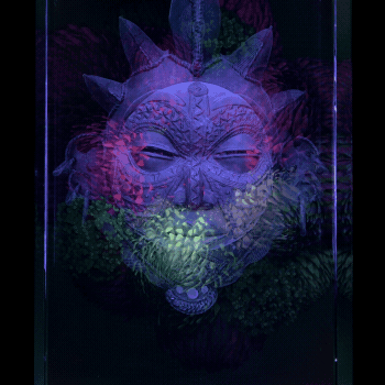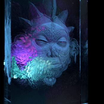Les Astérales sont un ordre de plantes très riches en espèces dans lesquelles ont trouve les chrysanthèmes. Astérales utilise un masque traditionnel africain dont la version numérisée est parsemée d’ asteraceae. Gravée au laser dans un bloc de verre, la sculpture du masque est ici augmentée par de la lumière et de la projection. L’association d’un élément de la culture africaine, de la technologie, du verre et de la flore crée une installation singulière et anachronique qui résume particulièrement bien la richesse du travail de recherche de Yann Nguema.