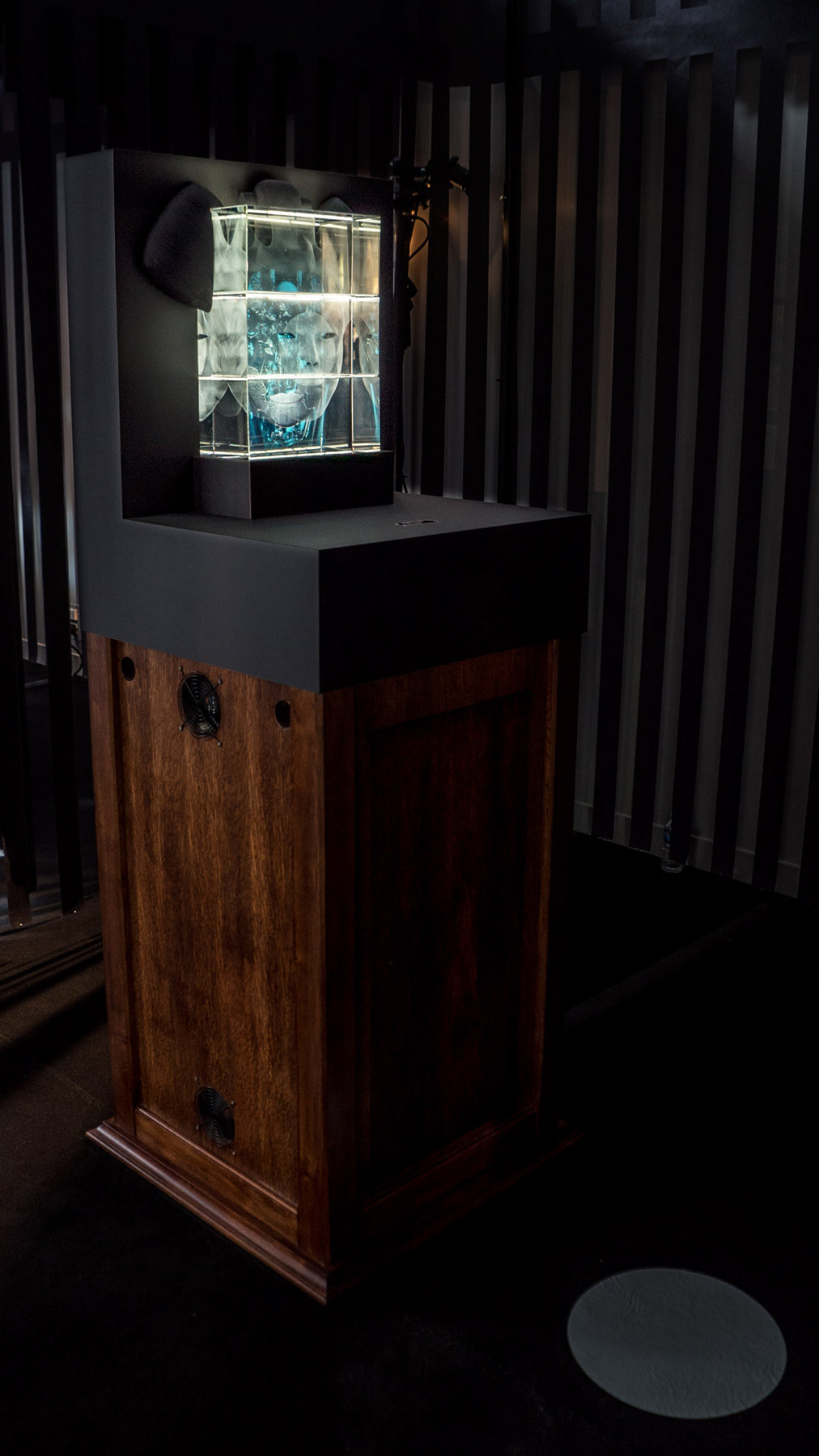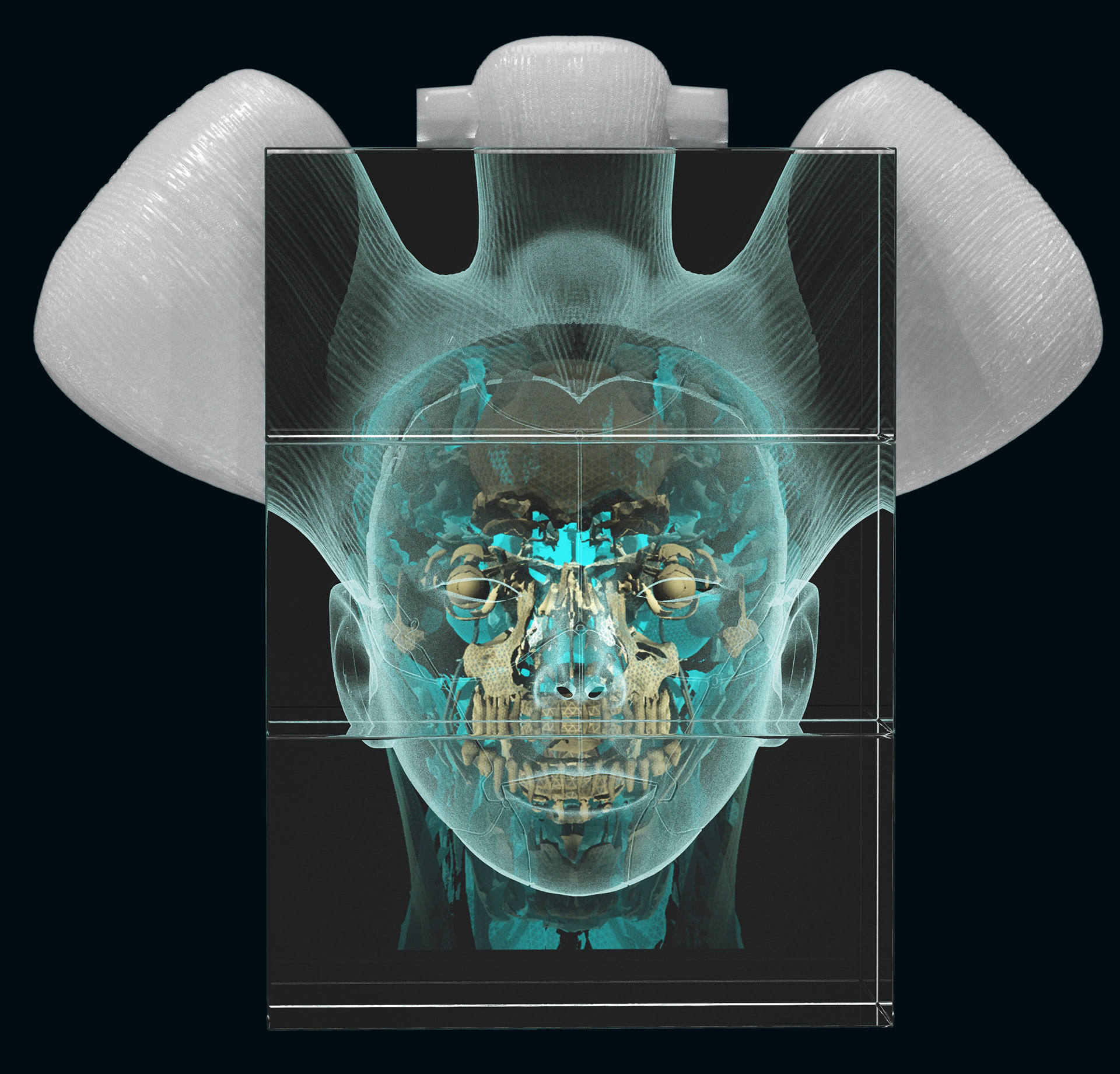 Anato-Me has initiated a cycle of research aimed at enhancing the notion of screen. A geisha mask, laser-engraved in 3 blocks of glass, has its real part extended by 3D prints. An interactive image showing an electronic atlas of human organs in 3 dimensions brings the whole thing to life. The Geisha mask is a reference to the manga "Ghost in the Shell" by Shirow Masamune. The digital skin was created using the BodyPart3D open-source anatomical database developed at the University of Tokyo.