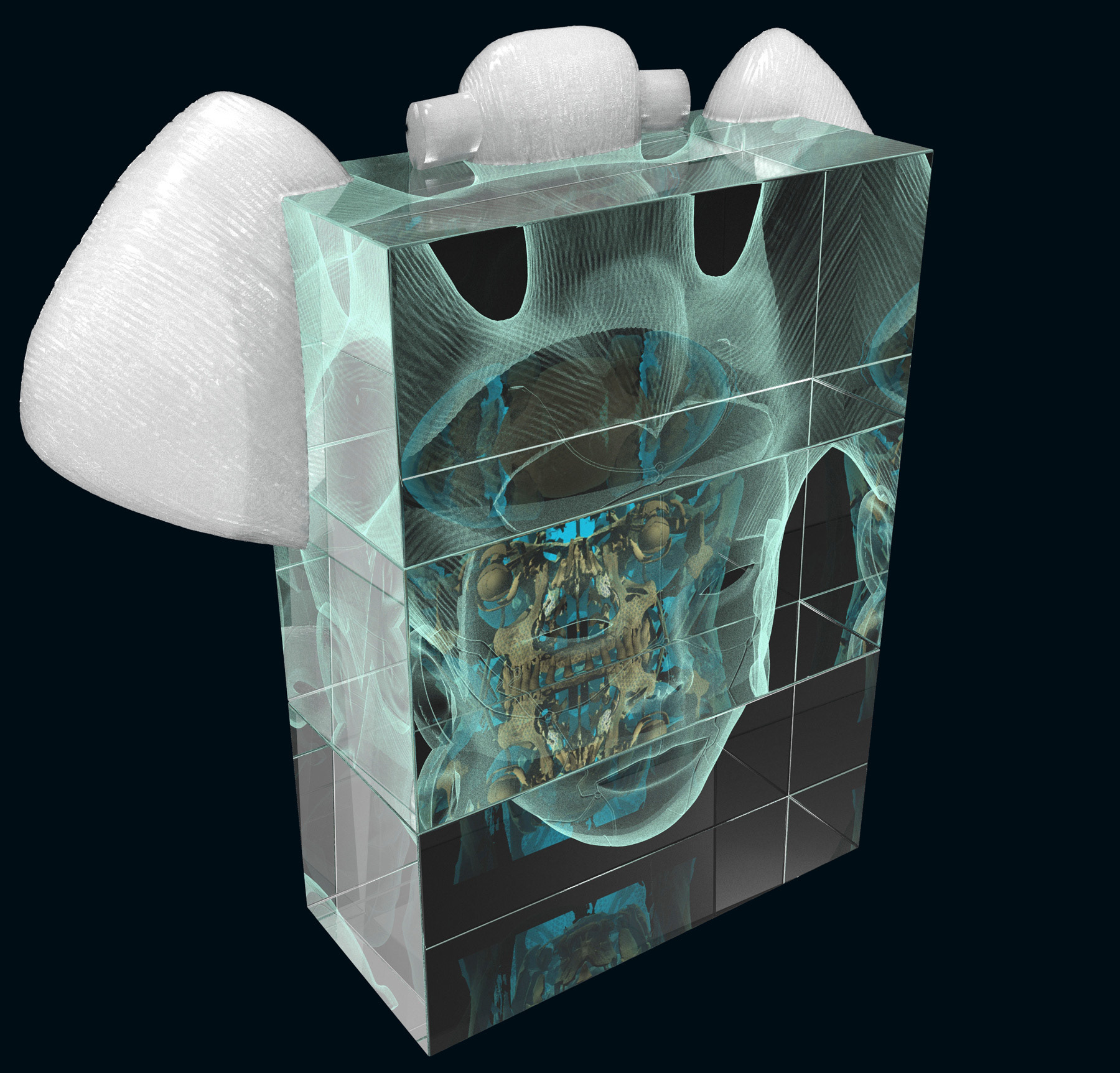 Anato-Me a initié un cycle de recherche visant à augmenter la notion d’écran. Un masque de geisha, gravé au laser dans 3 blocs de verre, est prolongé dans sa partie réelle par des impressions 3D. Une image interactive diffusant un atlas électronique d’organes humains en 3 dimensions vient donner vie à l’ensemble. Le masque de Geisha fait référence au manga “Ghost in the Shell” de Shirow Masamune. L’écorché numérique a été réalisé à l’aide de la base de données anatomique open source BodyPart3D conçue à l’université de Tokyo.